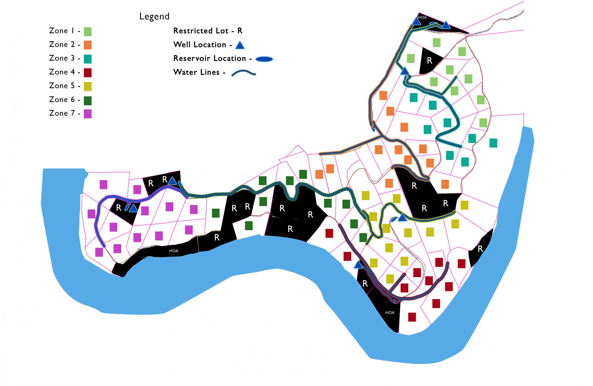 The couple of maps below are to give an idea of the areas we desperately need to replace existing water lines as well as add water lines. There are several scenarios depending on the well sites that the county approves. In any case, the map of water lines is going to stay about 85% the same for this area of the community. This is only a visual to help understand the location of construction and updating.